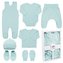 Soupravička obsahuje vše, co budete při péči o své dítě potřebovat: celorozepínací body s dlouhým rukávkem, které usnadňuje oblékání díky praktickému zapínání po celé délce a mezi nožičkami, dupačky a polodupačky se zapínáním na cvočky na ramínkách a mezi nožičkami pro snadné přebalování, pohodlný kabátek na cvočky, čepičku s širším lemem, která bezpečně drží na hlavičce, a také jemné rukavičky a capáčky s pružnými manžetkami.