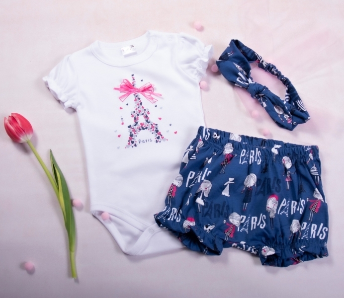 K-Baby 3dílná dětská sada, body s kr. rukávem, kraťásky, čelenka Love Paris, granát; 62 (2-3m)