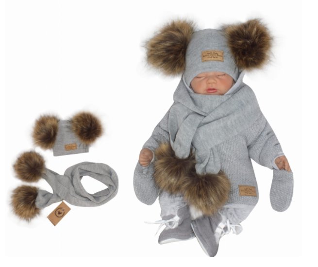 Z&Z Zimní čepice s bambulemi z kožešinky a šálou 2V1, šedá; 56-68 (0-6 m)