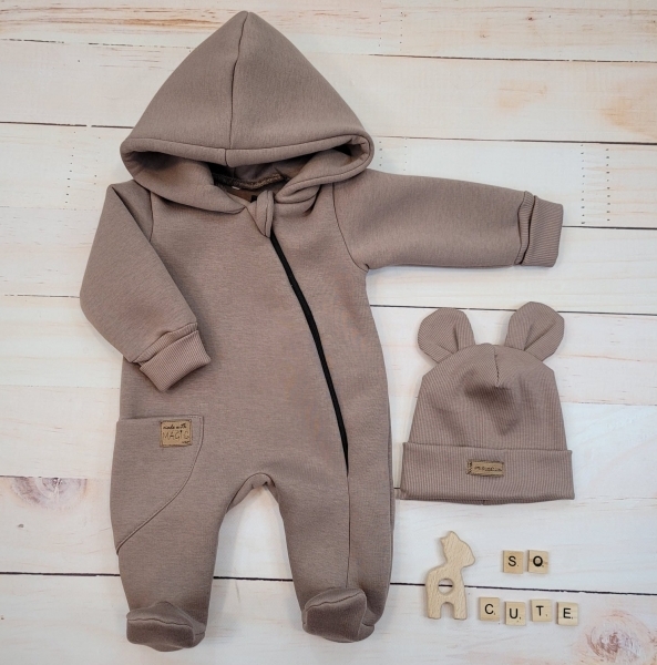 Oteplený dětský overal se šlapkama a kapucí + čepička, 2D, Kazum, čokoládový, vel. 74; 74 (6-9m)