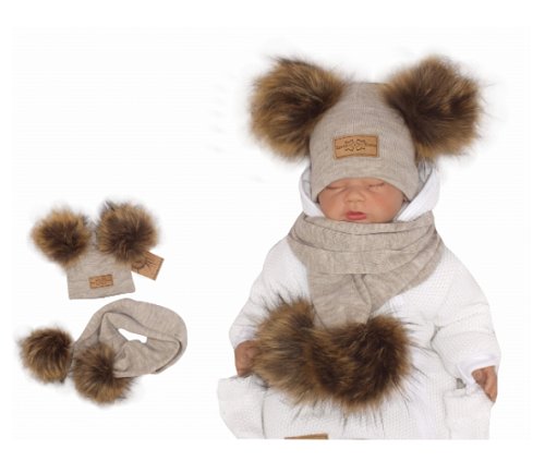 Z&Z Zimní čepice s bambulemi z kožešinky a šálou 2v1, béžová, vel. 68/80; 68-80 (6-12m)
