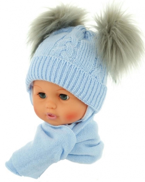 Zimní čepička s šálou - chlupáčkové bambulky - sv. modrá; 56/62 (0-3m)