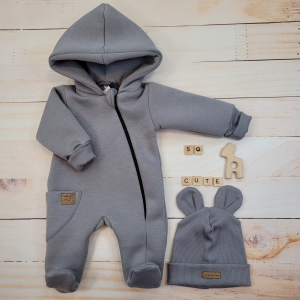 Oteplený dětský overal se šlapkama a kapucí + čepička, 2D, Kazum, šedý, vel. 68; 68 (3-6m)