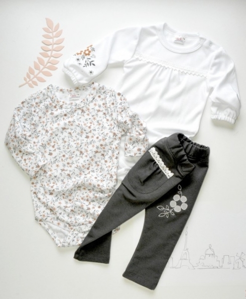 K-Baby Sada 2 x body dl. rukáv + 1 x tepláčky, Louka, bílá/květinky/šedá, vel. 68
