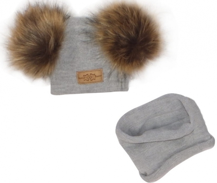 Z&Z Zimní čepice s bambulemi z kožešinky + komínek, šedá; 56-68 (0-6 m)