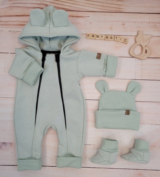 Oteplený dětský overal bez šlapek s kapucí, čepička + botičky, 3D, Kazum, mátový, vel. 74; 74 (6-9m)