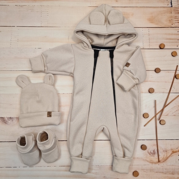 Oteplený dětský overal bez šlapek s kapucí, čepička + botičky, 3D, Kazum, béžový, vel. 62; 62 (2-3m)