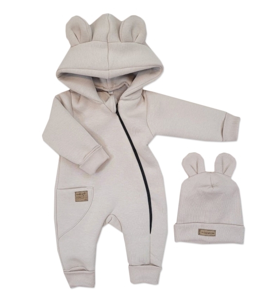 Oteplený dětský overal bez šlapek s kapucí + čepička, 2D, Kazum, béžový; 56 (1-2m)