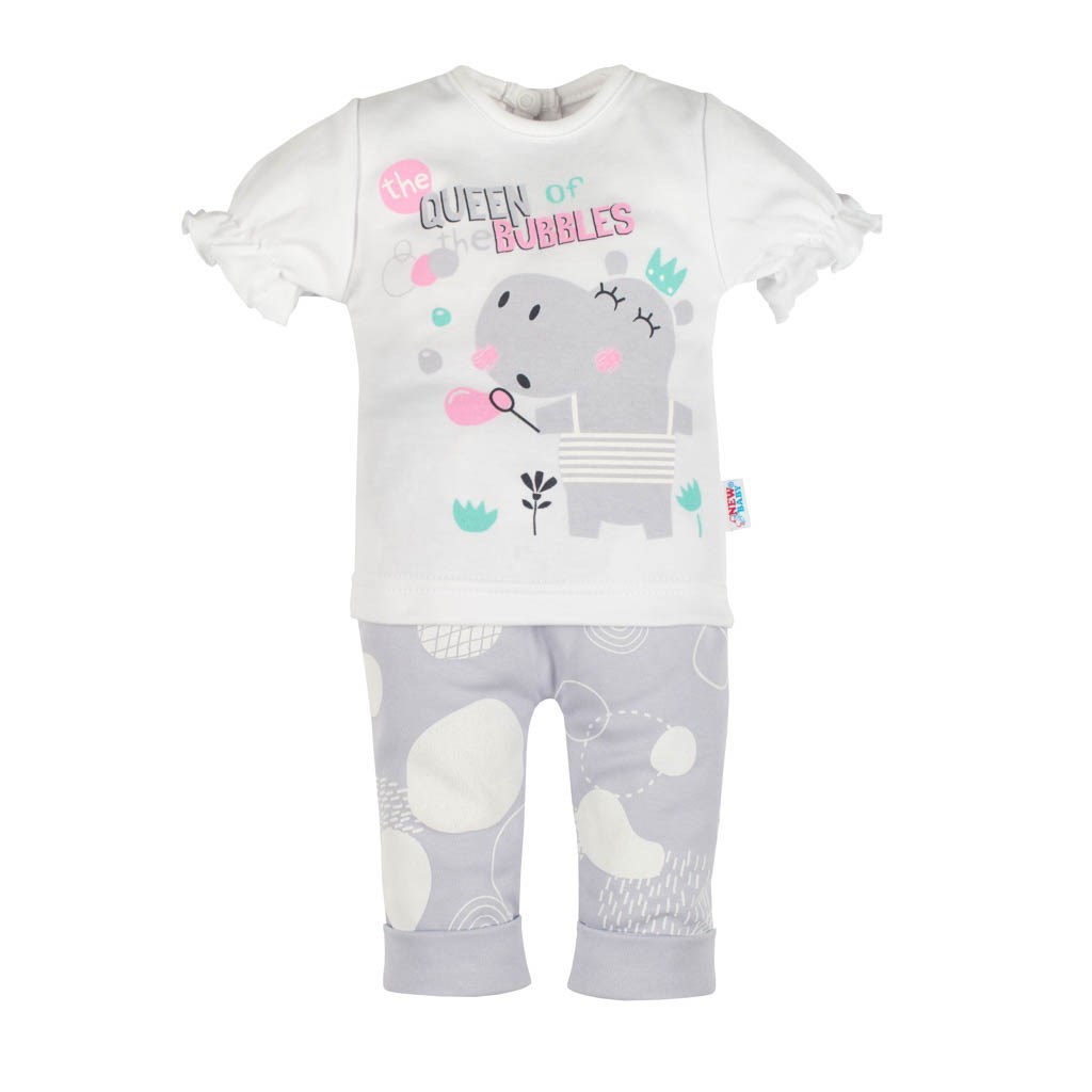 Krásná a veselá letní 2-dílná bavlněná soupravička české značky New Baby Queen. Holčičí soupravička obsahuje tričko a tepláčky. Tričko je zdobeno veselým obrázkem hrošíka a nápisem the Queen of Bubbles s krátkým nařaseným rukávkem s jemnou gumičkou. Tričko má zapínání na zadní straně na cvoček. Tepláčky jsou potištěné zajímavým vzorem, v pase mají širší gumičku a nohavičky jsou ukončené elegantními manžetkami. Super letní hit a užitečný kousek do šatníku malé parádnice. Složení 100% bavlna. Rozměr tričko: obvod kolem hrudníku cca 52 cm, délka rukávu cca 13 cm, celková délka cca 36 cm. Tepláčky: obvod kolem pasu cca 46 cm, délka od rozkroku cca 20 cm, celková délka cca 38 cm.