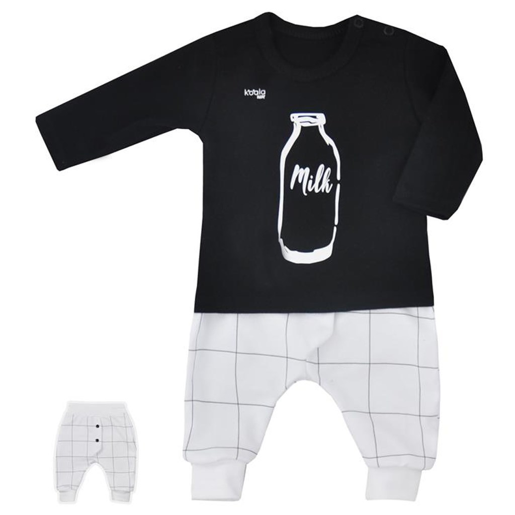 Moderní dětská 2-dílná soupravička Koala MILK. Součástí soupravičky jsou tepláčky a tričko. Tričko má zapínání na cvočky na ramínku a zdobí ho obrázek lahvičky a nápis MILK. Tepláčky mají na nohavičkách a v pase široký lem, imitaci cvočkú a stylový snížený sed, který dodává ten správný šmrc. Má všestranné využití. Moderní vzhled a střih soupravičky bude děťátku velmi slušet. Materiál: 100% bavlna.