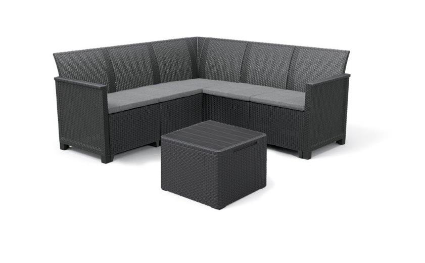 Díky nábytku Keter Elodie si na zahradě, terase, v pergole či na balkoně vytvoříte krásné a pohodlné posezení. Připravíte se na slunečné dny, které strávíte u kávy na čerstvém vzduchu, nebo pozvete na návštěvu své příbuzné a přátele. Sada obsahuje rohovou sedačku a stolek s praktickým úložným prostorem. Do něj můžete uchovat například podsedáky. Celkově vám poskytne 5 míst k sezení.