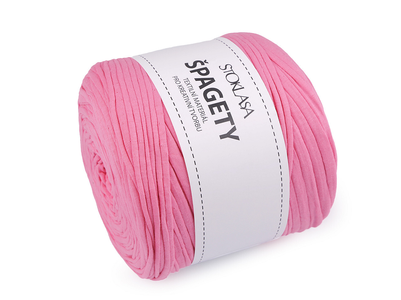 Špagetovou přízi tvoří nařezané proužky látky z recyklované bavlny. Příze je mírně elastická. Využijete ji na pletení a háčkování koberečků, dek, tašek, šál, košíků, batohů, povlaků na polštáře apod. Je příjemná na dotek, vhodná i k pletení rukama.