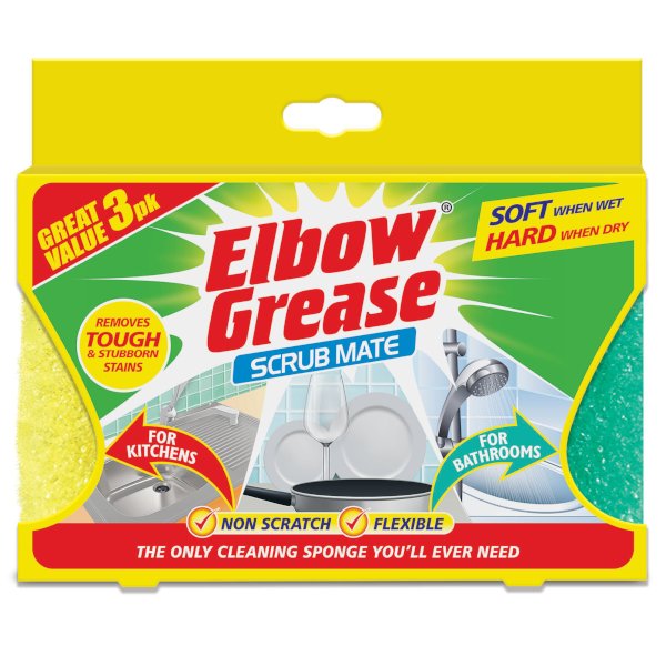 Elbow Grease Scrub Mate - flexibilní neškrábavá houbička do kuchyně a koupelny - 3ks Elbow Grease speciální houbička, která je flexibilní pro dokonalé odstraňování i odolných nečistot v kuchyni a koupelny Tato houbička je dokonale flexibilní a tak se dostane do každého rohu a koutu. Houbička má abrazivní vrstvu, která je šetrná k teflonovému nádobí, na které působí jako drátěnka, ale nepoškrábe ho.Nejflexibilnější čisticí houbička všech dob! Scrub Mate houbička je ideální pomocník pro použití v domácnosti, kuchyni, venku a v koupelně bez poškrábání povrchů.Když houbičku namočíte do HORKÉ vody stane se z ní měkká houbička, která odstraňuje špínu a skvrny z těžko dostupných míst, také na mytí sklenic, drhnutí hrnců a pánví.Když je houbičku namočíte do STUDENÉ vody a necháte ji ztuhnout, bez problému vyčistí odolnější skvrny, špínu i tužší připečenou mastnotu.