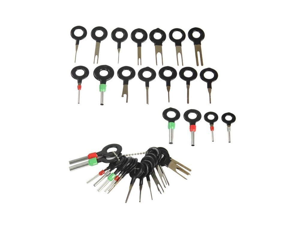 Sada 18 ks klíčů pro rozpojení konektorů v elektroinstalacích je nepostradatelným vybavením každého elektronika, elektrikáře. Pomocí sady snadno a rychle opravíte spoje připojení bez nebezpečí jejich poškození. Kompletní sada pro většinu běžně dostupných konektorů. Rukojeť je potažená gumou, která zvyšuje komfort práce, užitečné pro úpravy a opravy elektrických systémů v automobilech, motocyklech, lodích atd. Funguje také dobře doma při opravách domácích spotřebičů, a dalších. Ergonomický tvar umožňuje snadné vyjmutí kolíků práce také možná na zlomeném kolíku nebo ohnuté desce konektoru nepoškodí čepy.