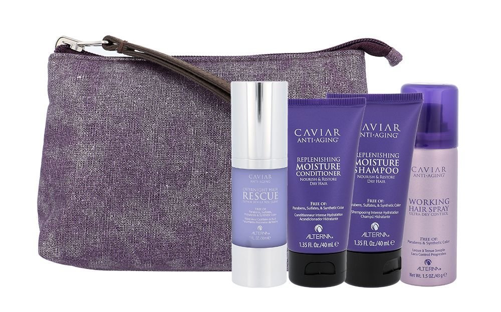 Kazeta pro regeneraci vlasů **Alterna Caviar Transformation Kit**. **Složení kazety**: **Replenishing Moisture 40 ml - Šampon** Šampon Alterna Caviar Replenishing Moisture Shampoo Dry Hair poskytuje suchým vlasům potřebnou hydrataci a péči. Jemně vlasy čistí a odstraňuje veškeré nečistoty. Zároveň chrání barvu vlasů před vyblednutím a poškozením. Složení obsahuje extrakt z kaviáru a vitamín C, které vlasy posilují a vyživují. Dopřejte svým vlasům hloubkovou péči a ochranu. **Složení**: extrakt z kaviáru - posiluje vlasy vitamín C - chrání a vyživuje vlasy **Použití**: Aplikujte na vlhké vlasy. Jemně vmasírujte a poté důkladně opláchněte. **Replenishing Moisture 40 m - Kondicionér** Kondicionér Alterna Caviar Replenishing Moisture Conditioner Dry Hair obnovuje a regeneruje suché vlasy. Složení obsahuje Photozyme Complex, který chrání vlasy před poškození. Extrakt z kaviáru a vitamín C posilují a vyživují vlasy. **Složení**: Photozyme Complex extrakt z kaviáru vitamín C **Použití**: Aplikujte na umyté vlasy. Nechte chvíli působit a poté důkladně opláchněte. **Overnight Hair Rescue 30 ml - Vlasová péče** Maska na vlasy vlasy hloubkově regeneruje během spánku. Bohaté složení vlasy posiluje a vyživuje. **Použití**: Aplikujte večer na suché vlasy. Nechte působit přes noci a ráno vlasy umyjte šamponem. **Hairspray 43 g - Lak na vlasy** Snadno se aplikujte a zajišťuje bezchybný vzhled účesu.