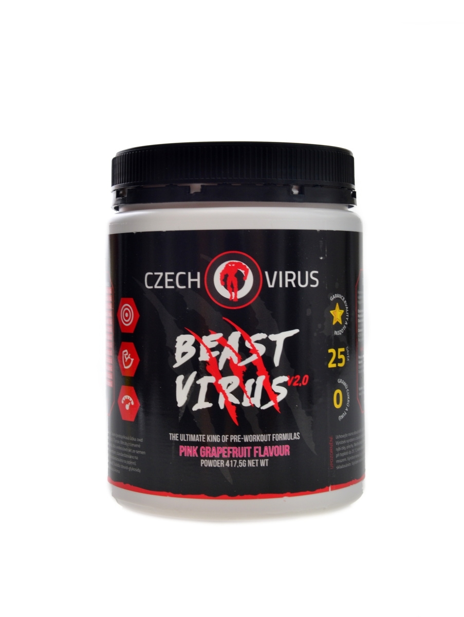 Beast Virus® V2.0. je horkou novinkou z dílny nejoriginálnější české značky Czech Virus®. Původní Beast Virus pravděpodobně není potřeba ani představovat, tento produkt způsobil naprosto bez debat revoluci v kategorii před tréninkovek a udával trendy ostatním značkám, které Beast velmi rády napodobovaly. Doba jde však stále kupředu a proto jsme se po 5-ti letech rozhodli naši originální recepturu inovovat a přinést na český trh zpět krále českých před tréninkovek. Nic jsme neubírali, pouze jsme přidali 4 nové látky = 13 aktivních látek celkem!