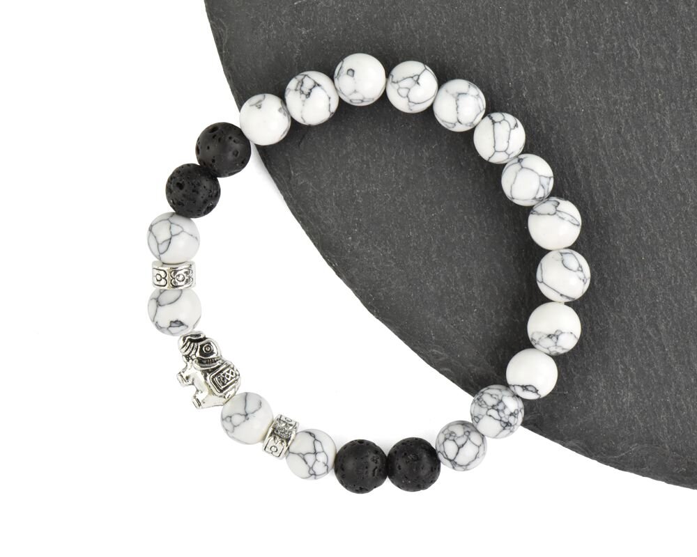 Slon se vztyčeným chobotem symbolizuje štěstí, odvahu, sílu, radost a nové přílěžitosti.Velikost: univerzální Průměr jedné kuličky: 8 mm Materiál: kov, lávový kámen, umělý mramor