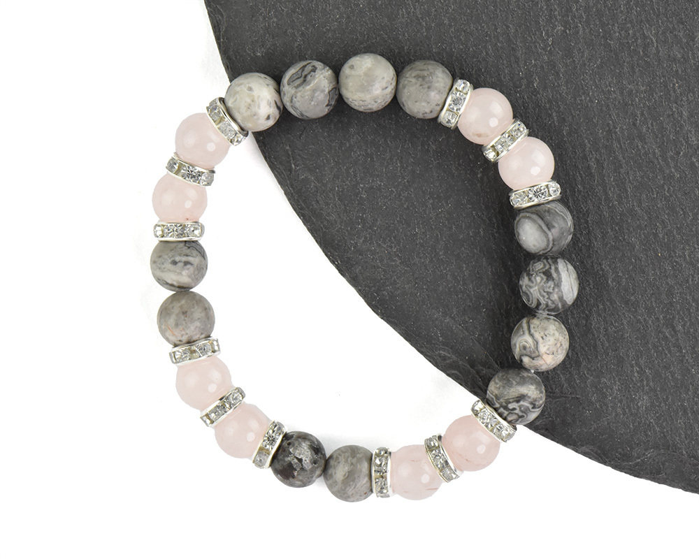 Náramek z růžových a šedých korálků doplněný o korálky s kamínky.Velikost: univerzální Průměr jedné kuličky: 8 mm Materiál: kov, plast, kámen