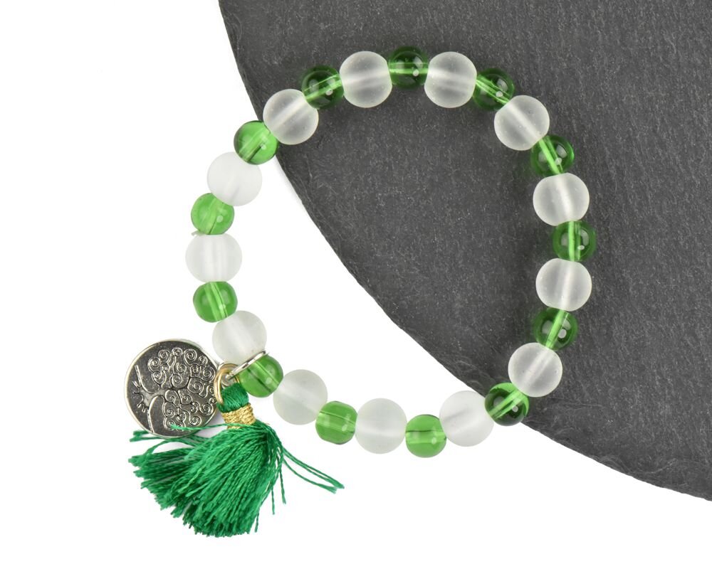 Náramek je vyroben ze skleněných kuliček navlečených na gumičce. Zdobí jej znak Stromu života, jeho žákladním významem je propojení všeho živého. Velikost: univerzální Průměr jedné kuličky: 8 mm Materiál: sklo, plast, kov
