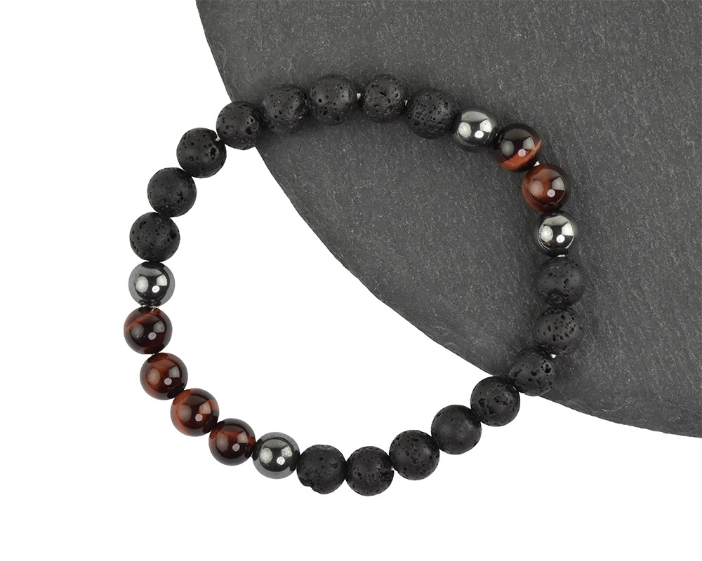 Lávový kámen - je kamenem se silnou pozitivní energií. Dodává sebejistotu, vitalitu a životní vyrovnanost. Nese v sobě sílu sopky. Zmírňuje záněty, otoky a bolesti. Posiluje imunitu a detoxikuje tělo. Harmonizuje své okolí a chrání nás před špatnou náladou. Býčí oko - je kamenem, který podporuje sebedůvěru, paměť, koncentraci a energii.Délka: cca 21-22 cmPrůměr jedné kuličky: 8 mm Materiál: lávový kámen, býčí oko
