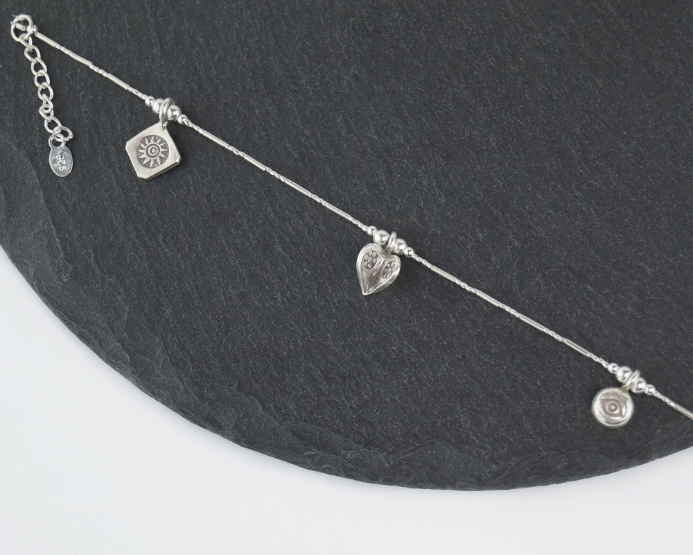Stříbrný náramek Stříbrný náramek zdobený přívěsky Slunce, srdce a oka. Zapínání na karabinku, s nastavitelnou délkou. Šperk je označen puncem ryzosti. Ryzost: Ag 925/1000 Délka: 17,5 - 19,5 cm Hmotnost: cca 4,65 g Upozornění: všechny stříbrné šperky lze zakoupit pouze přes e-shop. Jsme registrováni u puncovního úřadu. Veškeré informace naleznete zde.