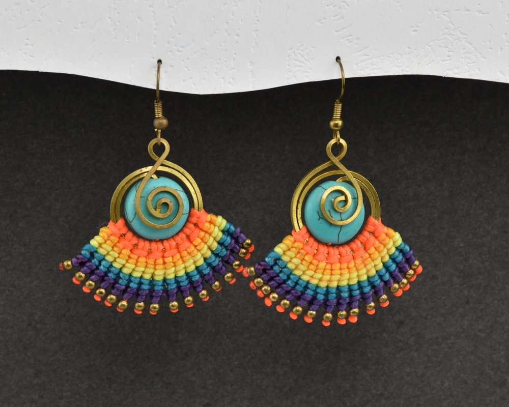 Ručně vyrobené drhané náušnice z voskovaného provázku, na kovovém základu, dozdobené drobnými preličkami a modrým Tyrkenitem.Každý pár těchto naušnic je jedinečný originál.