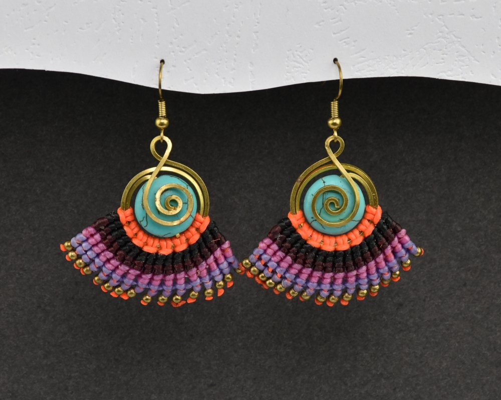 Ručně vyrobené drhané náušnice z voskovaného provázku, na kovovém základu, dozdobené drobnými preličkami a modrým Tyrkenitem.Každý pár těchto naušnic je jedinečný originál.