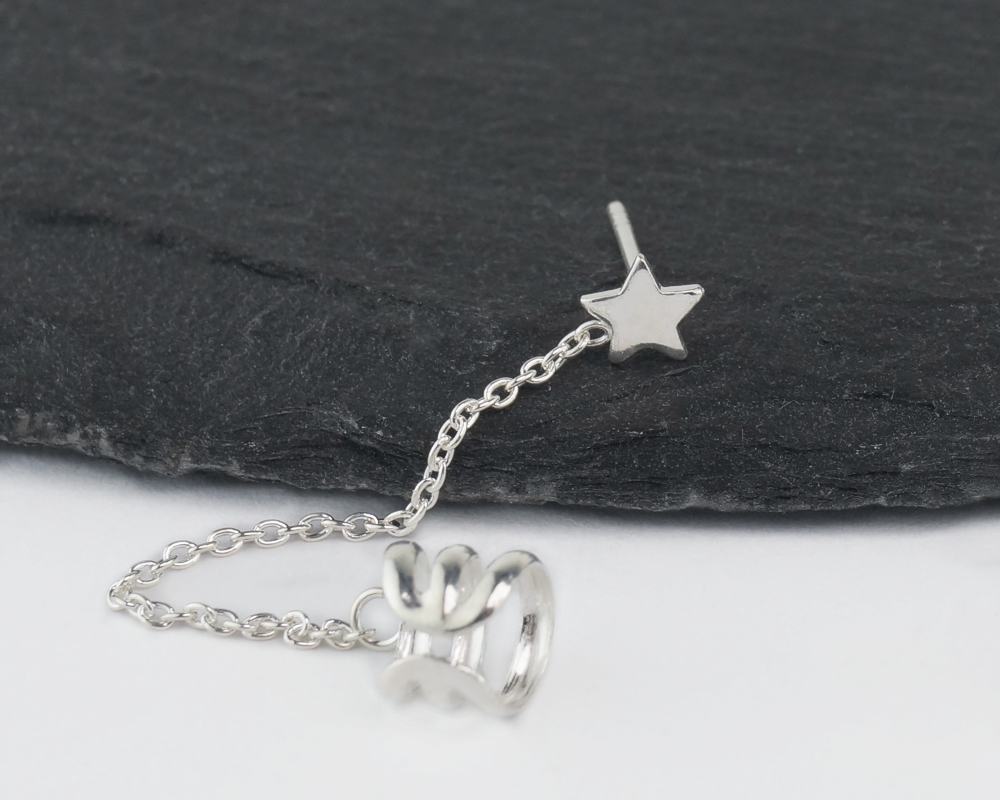 Stříbrná náušnice s puzetovým zapínáním a záušnicí na boltec spojená řetízkem - Hvězda - kus. Náušnice jsou označeny puncem ryzosti. Ryzost: Ag 925/1000 Celková délka: 50 mmDélka řetízku: 40 mm Průměr hvězdy: 5 mmZáušnice: 6 mmHmotnost: cca 0,45 g/kus Stříbrná puzeta je součástí balení.Upozornění: všechny stříbrné šperky lze zakoupit pouze přes e-shop. Jsme registrováni u puncovního úřadu. Veškeré informace naleznete zde.