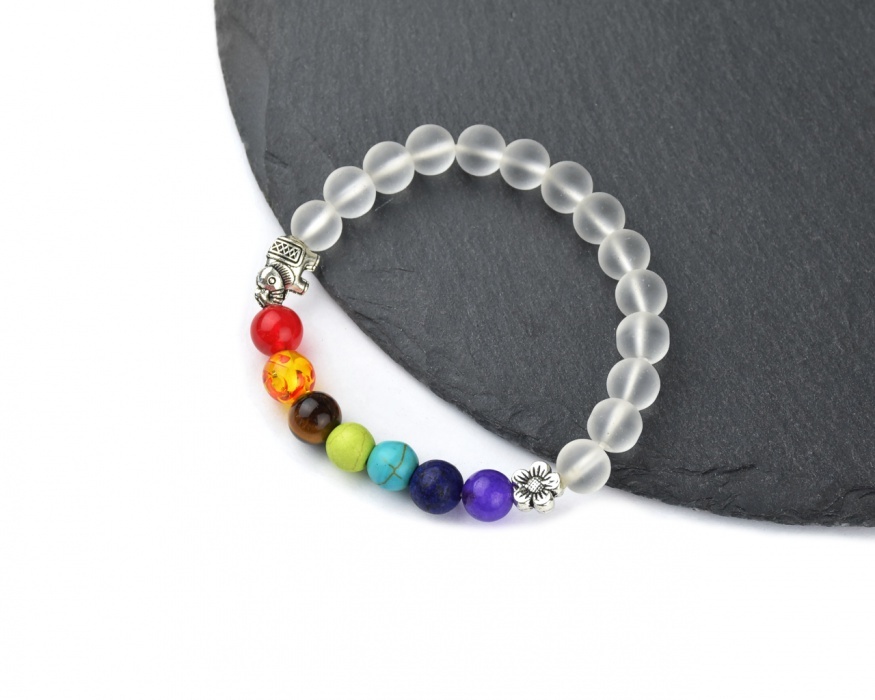 Náramek je vyroben ze skleněných kuliček navlečených na gumičce.