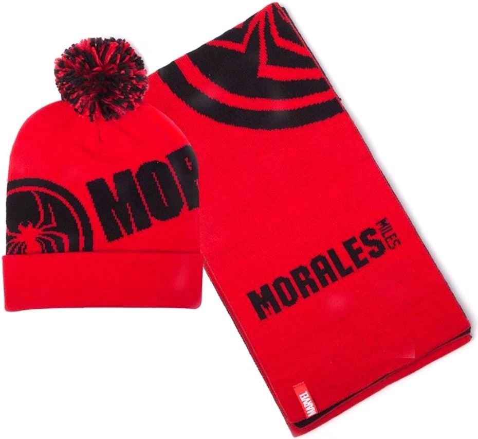 Oficiální zimní set, čepice a šála z katalogu produktů s logem a grafikou amerického akčního superhrdiny Spiderman.