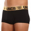 Černé boxerky s kratšími nohavičkami jsou vybaveny vytkávanou gumou v zlaté barvě s výrazným logem UNCS, což jim dodává moderní a extravagantní vzhled, který je jako stvořený pro sebejisté muže, kteří rádi vynikají. Kratší nohavičky poskytují volnost pohybu a zároveň skvěle vypadají, takže se boxerky UNCS hodí nejen pro speciální příležitosti, ale zaboduješ s nimi zkrátka kdykoliv.