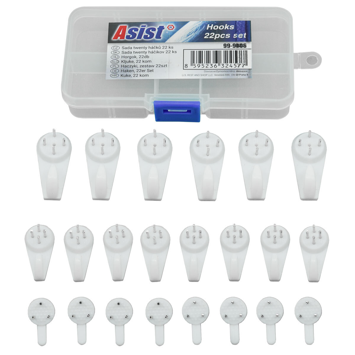 Sada háčků 22 ks ASIST 99-9006 - praktické řešení pro rychlé a čisté zavěšení obrázků, hodin a dalších drobností na hladké betonové stěny. Vše přehledně uložené v plastovém organizéru, připravené kdykoli po ruce.