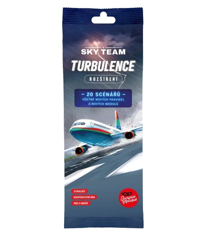 Nebe bylo zatím k vám pilotům poměrně shovívavé, ale vypadá to, že se brzy vše zvrtne, obloha se zatáhne a začnou se dít věci, které vás dokáží vyvést z míry. Navštívíte také nová, a ještě náročnější letiště. Cítíte to chvění? Nebo jsou to jen vaše ruce? Vítejte ve Sky Team Turbulence. Jedná se o rozšíření základní hry Sky Team, které přináší nové moduly a nové scénáře v nových destinacích. 20 nových scénářů včetně nových pravidel a modulů. Ke hře je nutná základní hra Sky Team.
