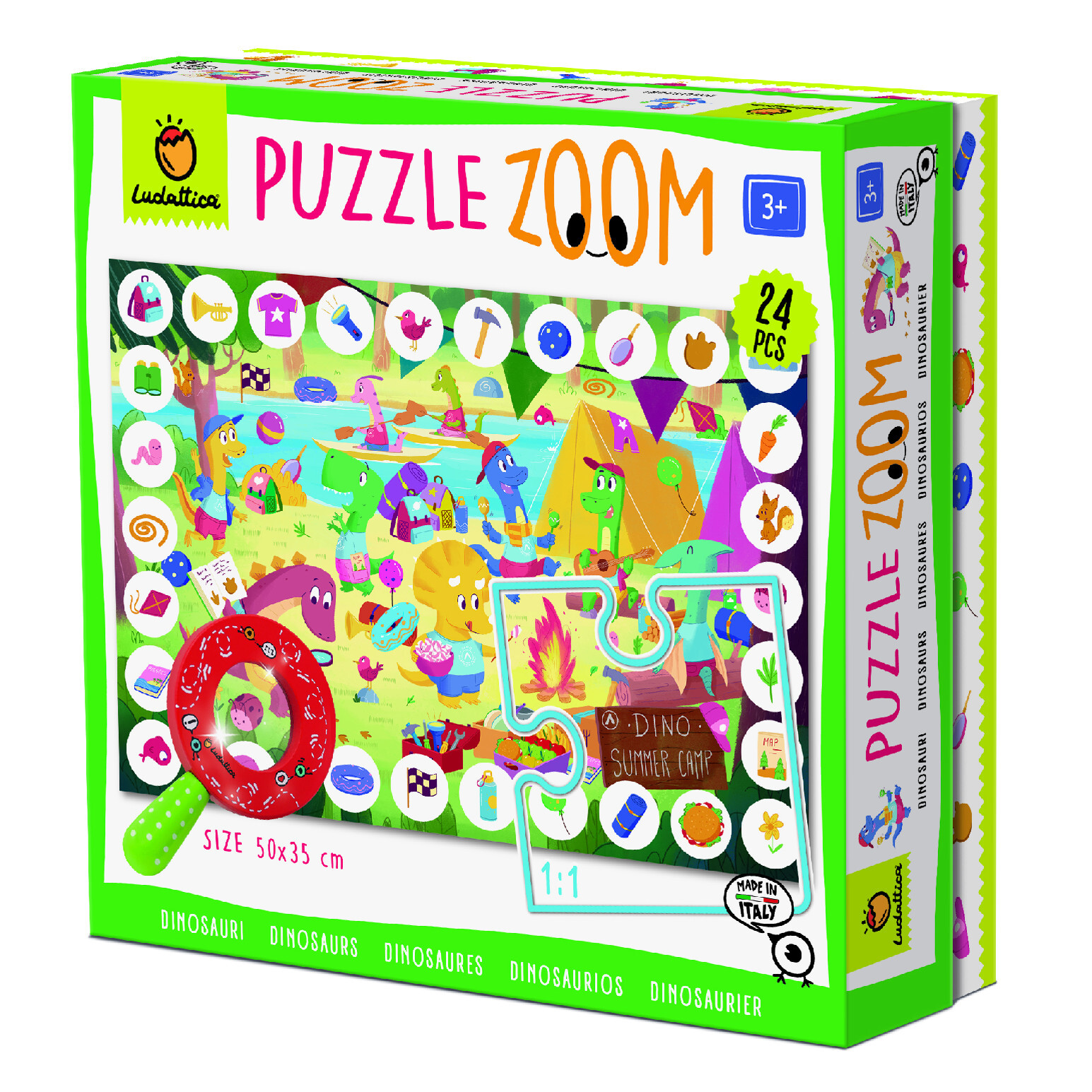 Veselé puzzle s motivem letního kempu pro dinosaury a lupou zaujme děti i dospělé. Hrou s puzzle děti procvičují jemnou motoriku a koordinaci oko-ruka, rozvíjejí pozorovací schopnosti, učí se soustředění a trpělivosti. Složením puzzle však hra nekončí! Přichází čas na detektivní pátrání po kempu.