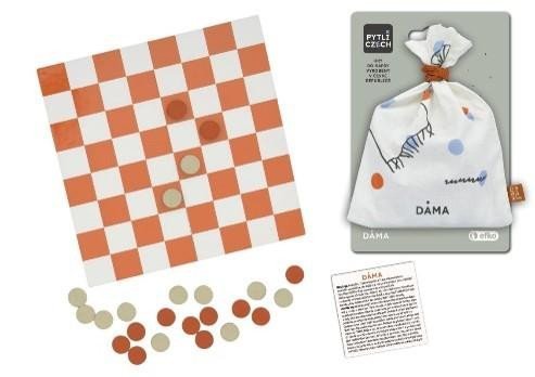 Logická desková hra Dáma v netradičním provedení. Navrženo tak, aby na cestách nezabrala příliš místa. Díky svému originálnímu designu se jistě stane i vhodným dárkem. Kvalitní herní plán a dřevěné kameny v textilním pytlíku. Vyrobeno v České republice.