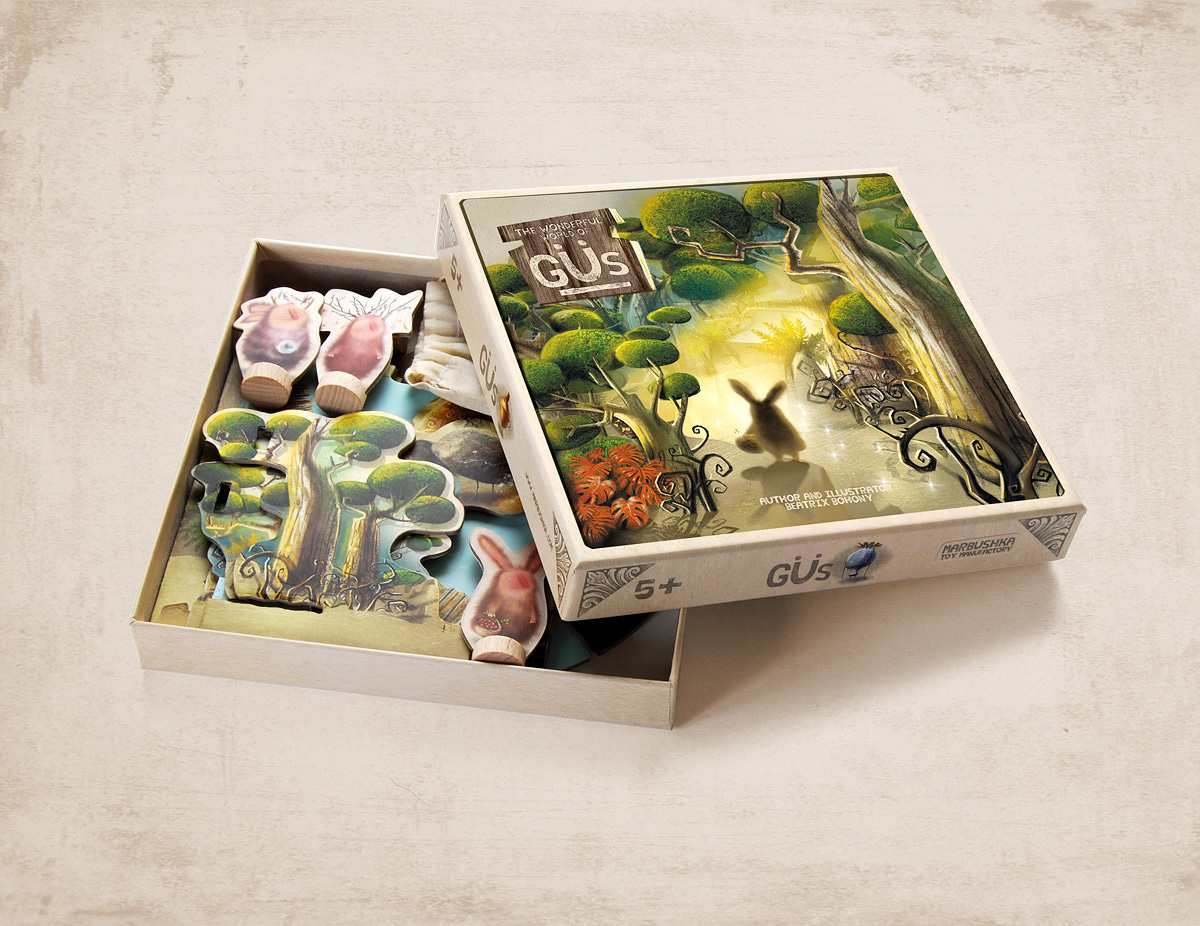 Obsah hry: herní plán s otočným lesem, 4 postavičky Gus, 1 postavička Morc, 4 lestní tvorové, 14 karet s recepty, 1 kostka, 24 krystalů.