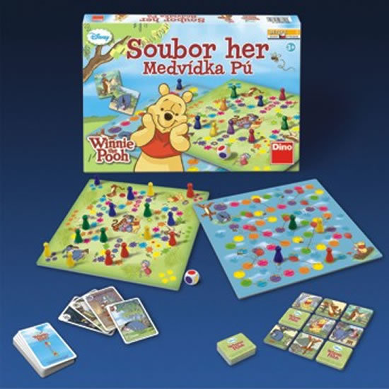 Soubor 4 her s ilustracemi Medvídka Pú a jeho přátel obsahuje 2 hry s obrázkovou kostkou a je tak vhodný pro děti od 3 let. Obsah:1 oboustranný herní plán,1 šestibarevná hrací kostka,24 figurek v 6 barvách,25 karet Černého Petra,48 kartiček Pexesa,1 návod