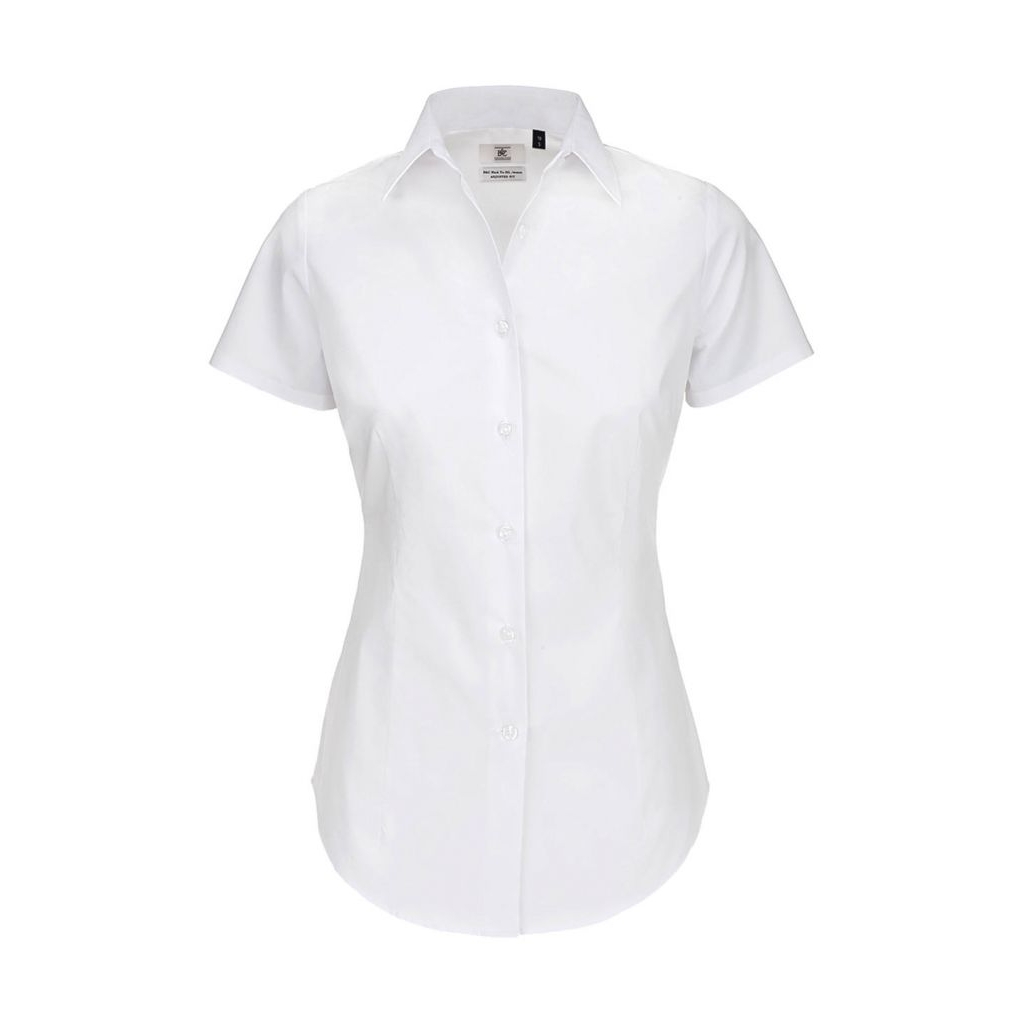 Dámská košile s krátkým rukávem od firmy B&C z hladkého a elastického popelínového materiálu. Má moderní zakulacený spodní lem, límec s měkkým lemováním, prsní záševky, přední a zadní panely pro lepší vypasování. Knoflíky jsou s perleťovým efektem , poslední otvor na knoflík je horizontální, dodávané spolu 1 náhradním knoflíkem. Manžety jsou nastavitelné na dva knoflíky s dalšími otvory na manžetové knoflíčky.