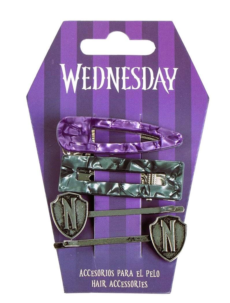 Tato sada obsahuje 2 sponky a 2 klipy, které jsou navrženy tak, aby snadno a bezpečně držely ve vlasech. Díky motivu Wednesday získáte stylový doplněk, který podtrhne vaši osobnost a zároveň nabídne praktické využití pro každodenní nošení nebo zvláštní příležitosti.