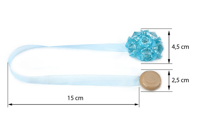 Stylová dekorativní ozdobná spona s magnetem na sepnutí záclon a závěsů. Spona se spíná silným magnetem na zadní straně a je spojena stuhou. Rozměr spony je O 4,5 cm, stuha je 30 cm dlouhá. Cena je za 2 kusy v balení.