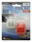 Svítilna na kolo, kočárek, či koloběžku s jednoduchým systémem upevnění pomocí pružných silikonových objímek. Lze snadno připevnit např. na řidítka, tyč pod sedlem, či jinou část jízdního kola. Lze použít na řidítka s různými průměry. Sada je složena ze dvou kusů, kdy jedno světo je bílé a jedno červené, světla nabízí dosvit do 15 metrů a světelný tok 18 lm. Ovládání je řešeno stisknutím skrytého spínače na vrchní části. Světlo tak nabízí 3x režimy (stálé svícení / rychlé blikání / pomalé blikání). Každé ze světel je napájeno 2x bateriemi CR2032 (jsou součástí), světlo tak vydrží až po dobu 7 hodin. Baterie lze jednoduše vyměnit sejmutím silikonového obalu z těla svítilny a odejmutím krytky baterií.