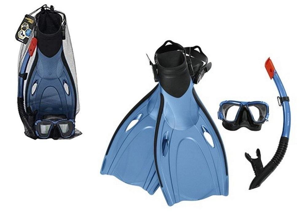 Zestaw Do Nurkowania Maska, Rurka, Płetwy Niebieski Bestway 25044 Ten zestaw do nurkowania posiada wszystko czego potrzebujesz do zwiedzania podwodnego morskiego świata. Zaopatrz się w niego jeżeli cenisz sobie wygodę oraz niezawodność. Maska wyposażona jest w soczewki ze szkła hartowanego, które zapewnią Ci odpowiednią widoczność pod wodą oraz ochronę przed uszkodzeniami. Szczelny kołnierz w masce zapobiega również przedostawaniu się wody do oczu, a pomimo to idealnie dopasowuje się do twarzy. Idealnym elementem bez którego nie mogłoby się odbyć nurkowanie jest dołączona również do zestawu fajka. Zawiera ona system Dry Top, który zapobiega infiltracji wody w przypadku zachlapania. Wyposażona jest również w zawór oczyszczający, który pozwoli usunąć nadmiar wody z rurki poprzez głęboki wydech. Idealne dopasowanie można uzyskać dzięki regulowanemu pasku przy masce oraz fajce. Ustnik jest wykonany z ortodontyczną precyzją dzięki czemu nie będzie powodował dyskomfortu a ty spokojnie będziesz mógł cieszyć się wodną atrakcją. Dołączone do zestawu płetwy posiadają antypoślizgową podeszwę oraz przycisk ułatwiający ściąganie. Dane techniczne: - Maska z regulowaną opaską - soczewki ze szkła hartowanego - system ochrony przed promieniami UV - fajka z systemem DRY TOP - płetwy w rozmiarze (37,5-41) - antypoślizgowa podeszwa w płetwach Wymiary opakowania; 14 cm x 22 cm x 54 cm