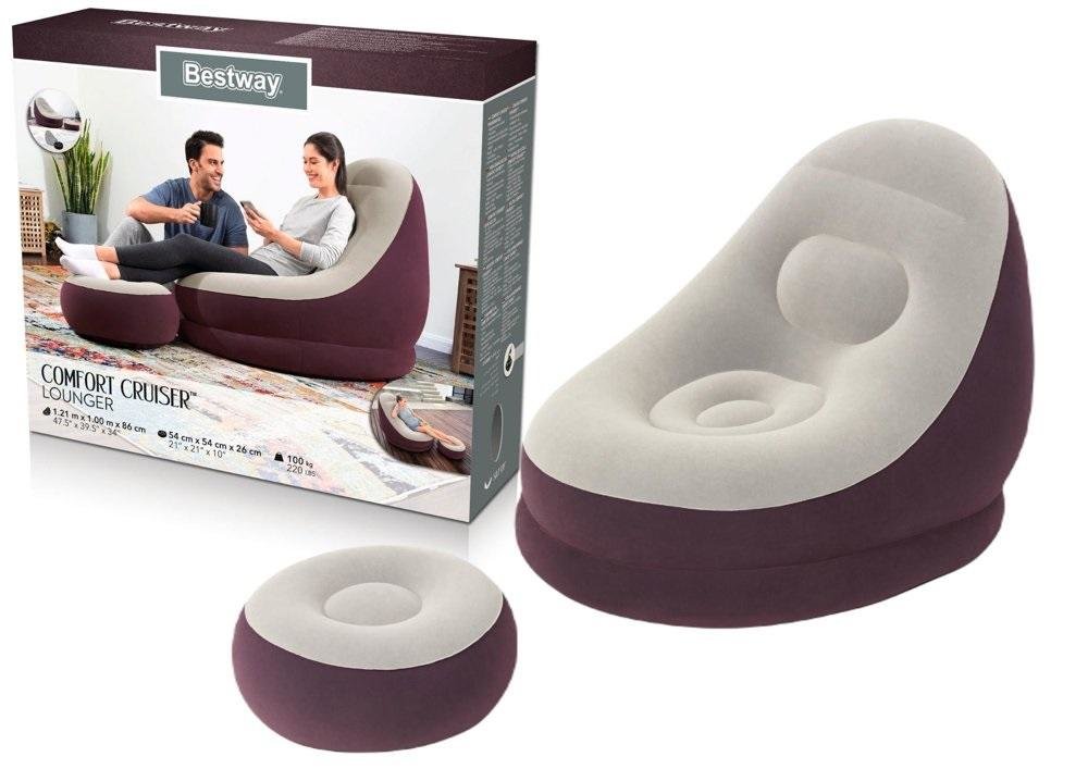 Dmuchany Fotel Z Podnóżkiem 122 x 94 x 81 cm Bestway 75053 Dmuchany fotel jest łatwy w konfiguracji, wymaga minimalnej ilości miejsca do przechowywania i jest super wygodny. Dzięki solidnej konstrukcji i przestronnej powierzchni krzesło to jest idealne, gdy przychodzą goście, aby zapełnić wolny pokój, obejrzeć mecz lub jako meble do pokoju w akademiku. Konstrukcja fotela zapewni maksymalny komfort, niezależnie od tego, czy leżysz, wyciągasz się, czy siedzisz prosto. Ponadto doskonale nadaje się do użytku w pomieszczeniach i na zewnątrz. Do Zestawu dołączony jest równie wygodny podnóżek, który zapewni dodatkowy komfort. Główne cechy: - Wymiary 122 x 94 x 81 cm - wygodna flokowana powierzchnia - Solidna konstrukcja typu coil beam -Rozmiar podnóżka: 54 cm x 54 cm x 26 cm / 21" x 21" x 10" - Wysokiej jakości oparcie i podnóżek - Zawory bezpieczeństwa - Dwudrożny zawór szybkiego i łatwego napełniania oraz opróżniania powietrza - Maksymalne obciążenie: 100 kg Waga: 3 kg Wymiary opakowania: 30 cm x 11 cm x 37 cm