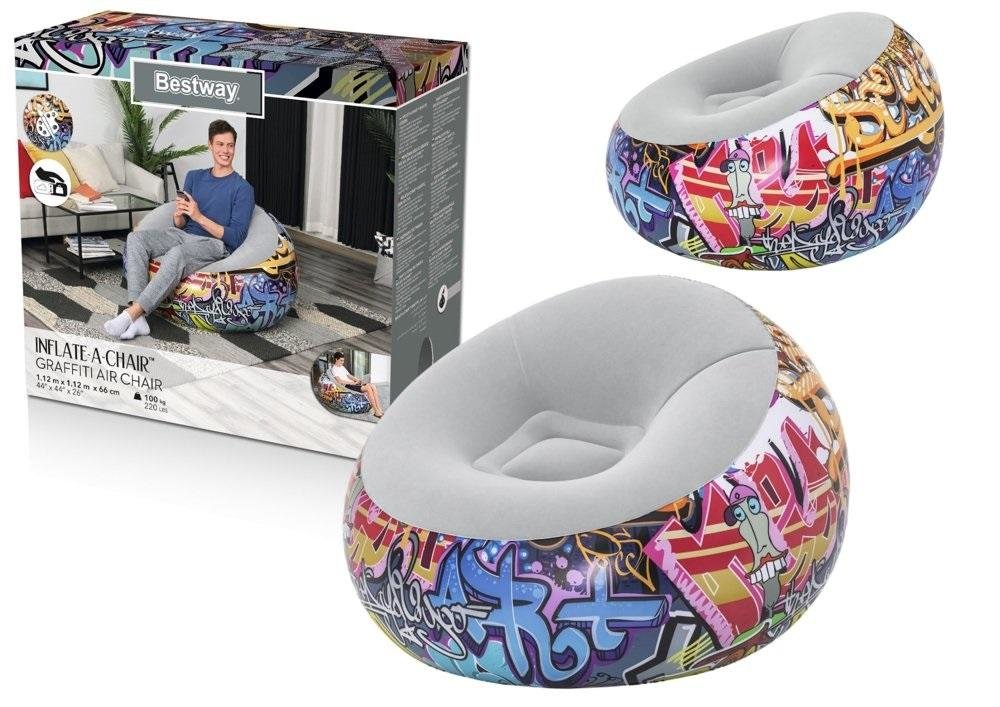 Dmuchany Fotel 112 x 112 x 66 cm Bestway 75075 Dmuchany fotel jest łatwy w konfiguracji, wymaga minimalnej ilości miejsca do przechowywania i jest super wygodny. Dzięki solidnej konstrukcji i przestronnej powierzchni krzesło to jest idealne, gdy przychodzą goście, aby zapełnić wolny pokój, obejrzeć mecz lub jako meble do pokoju w akademiku. Konstrukcja fotela zapewni maksymalny komfort, niezależnie od tego, czy leżysz, wyciągasz się, czy siedzisz prosto. Ponadto doskonale nadaje się do użytku w pomieszczeniach i na zewnątrz. Główne cechy: - Wymiary 112 x 112 x 66 cm - zawór szybkiego upuszczania powietrza - wygodna flokowana powierzchnia - Solidna konstrukcja typu coil beam - Ciekawy design - Maksymalne obciążenie: 100kg Waga: 12 kg Wymiary opakowania: 34 cm x 36 cm x 12 cm
