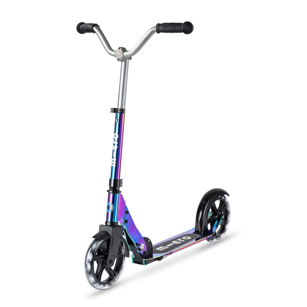 Micro Cruiser LED neochrome je skládací dětská koloběžka v nepřehlédnutelné neochromové barvě a je vybavena velkými LED svítícími kolečky.