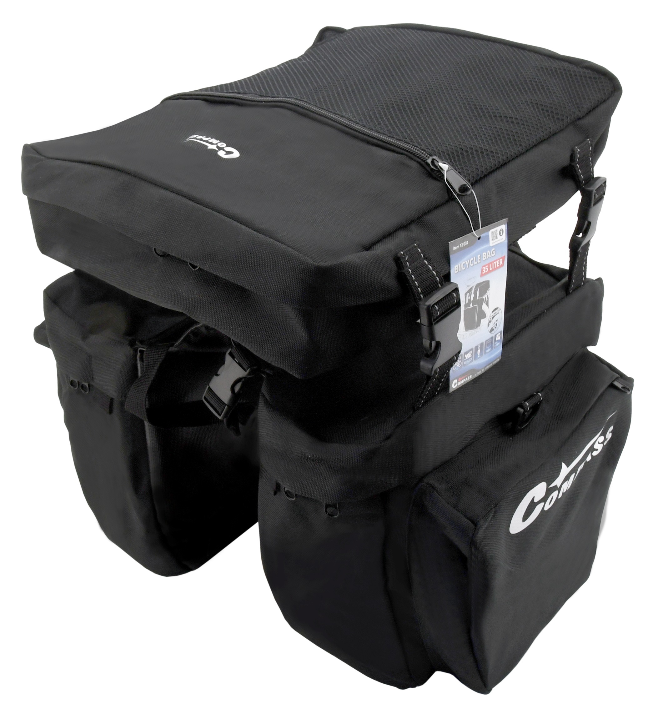 Prostorná cyklotaška s odepínatelnou vrchní brašnou, pro nosič jízdního kola. Taška je opatřena postraními 12L kapsami a odepínatelnou vrchní 11L brašnou. Přední část tašky a vrchní brašna jsou navíc doplněny o další sítěné kapsy. Kapsy jsou, vyjma sítěných, opatřeny zapínaním na zip. Díky této cyklotašce je možné s sebou vozit objemné náklady, např. nákupy, které jinak nelze na kole bezpečně vozit. Spodní část je opatřena nastavitelnými přezkami, pro jednoduché upnutí u různých rozměrů nosičů. Díky použitému materiálu, zejména z vnitřní strany, je taška robustní a lehce omyvatelná.