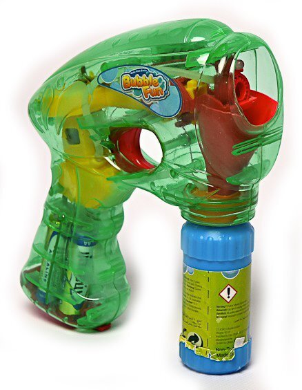 Návod: Našroubujte bublifukovou náplň k pistoli, stiskněte spoušť a užívejte si proud bublin!