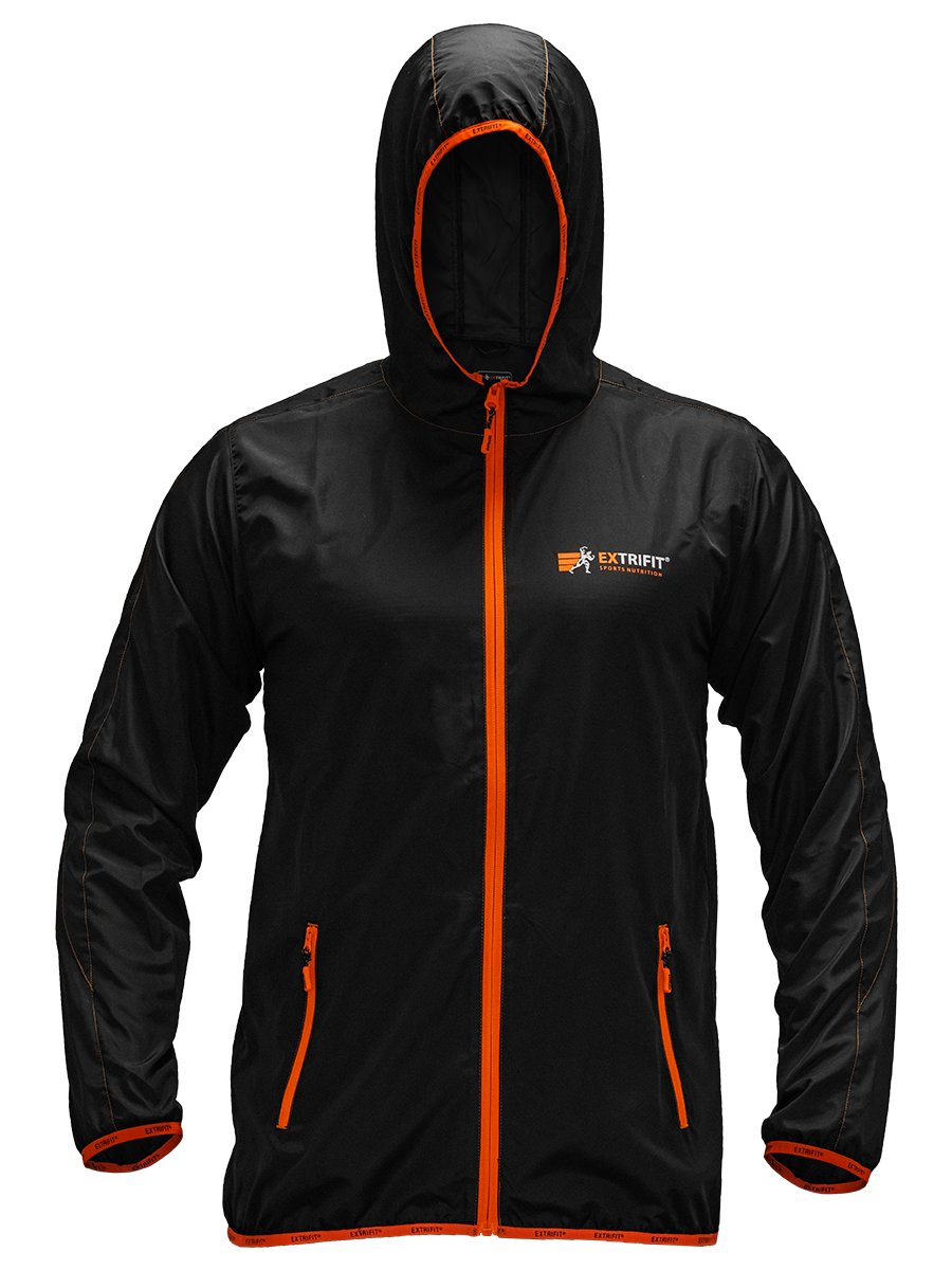 Extrémně lehká bunda firmy Extrifit s potiskem a děrováním, s kapucí a dvěma kapsami na zip vpředu. Černá barva s oranžovými aplikacemi - kontrastní pružné obruby kapuce, rukávů a spodního lemu (s černým nápisem Extrifit), zip bundy i kapes. Poutko na pověšení, prodlužovače jezdců zipů oranžové s...