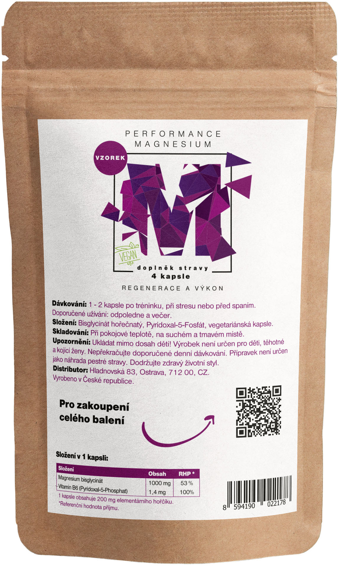 Performance Magnesium 1000 mg, (Hořčík 200 mg + Vitamín B6), 4 rostlinné kapsle, VZOREK