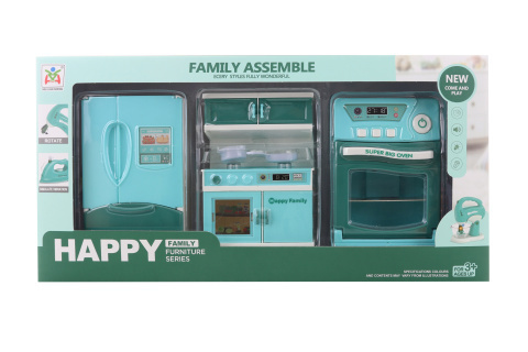 Sada obsahuje kuchyňku s vařičem, troubu a ledničku. Napájení na baterie, které nejsou součástí balení-kuchyňka 2xAAA, trouba 3xAA, lednička 2xAA. Spotřebiče svítí a vydávají zvuky. Balení obsahuje také malé nádobí,potraviny a samolepky. Materiál plast. Baleno v krabici. Rozměry balení cca...